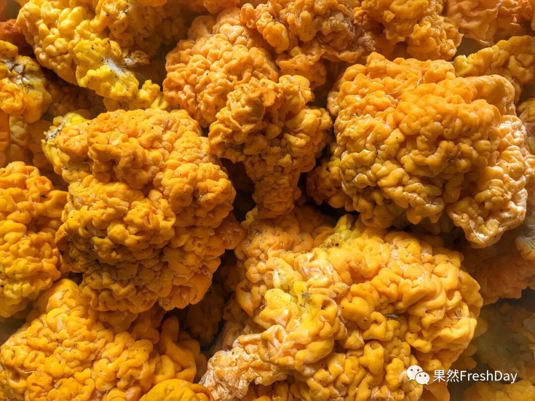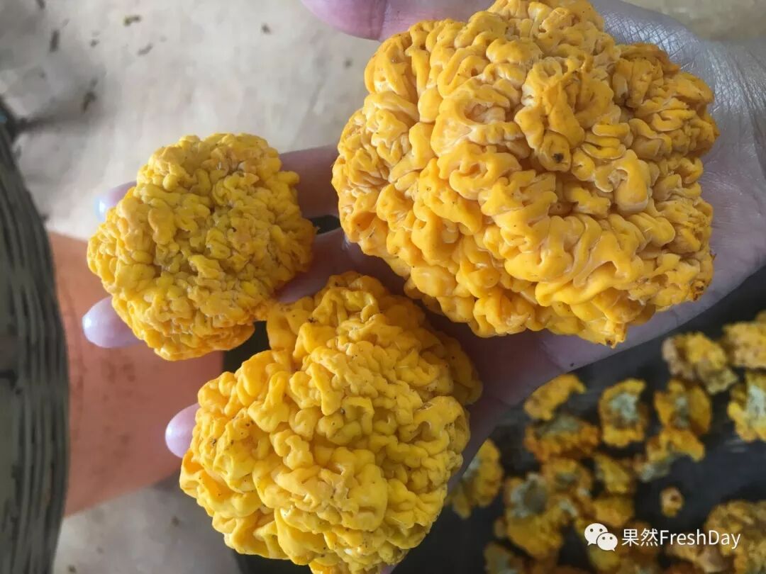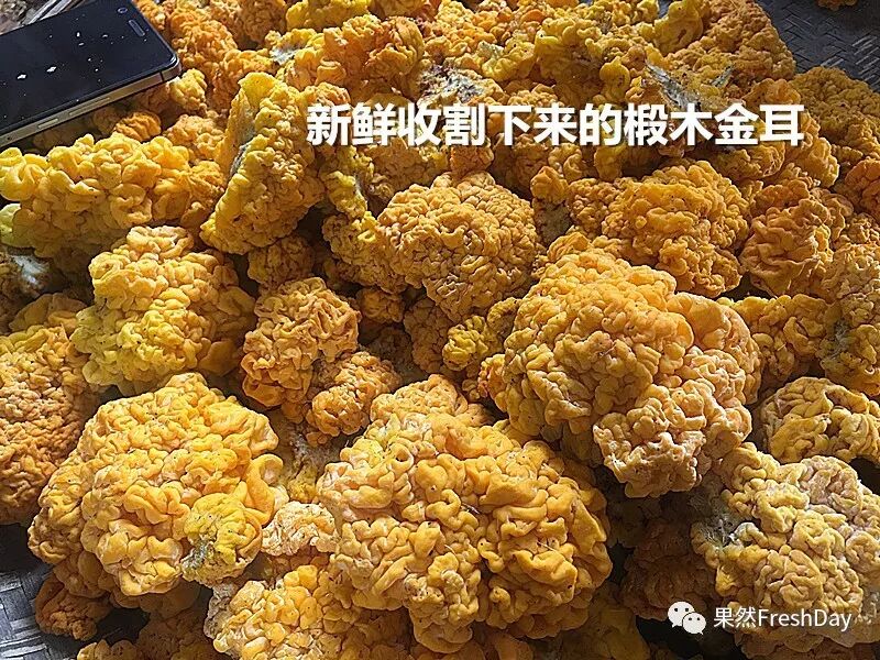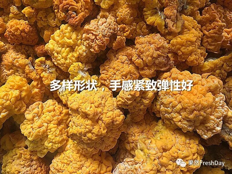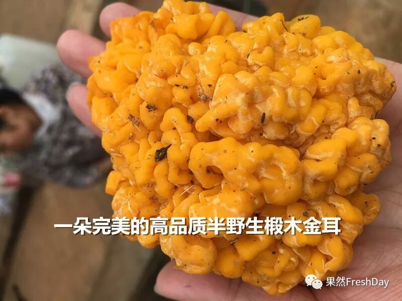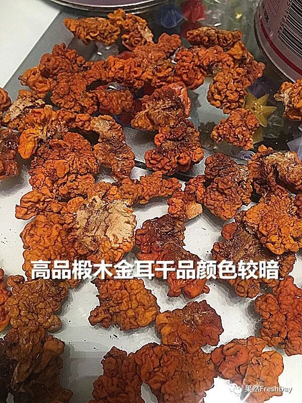 优良的椴木金耳成熟时有新鲜的柠檬黄色、橙色、金黄色、甚至橘红色。