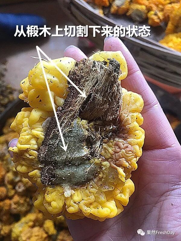 真正的椴木金耳是成熟后直接从椴木上收割下来的,切口不会均匀整齐,并且会带有椴木上的很多杂质。而菌包的切口则很整齐均匀,金耳也较干净。