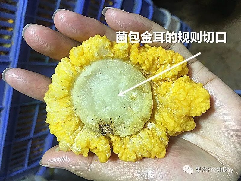 这是最容易区别椴木金耳与菌包金耳的地方