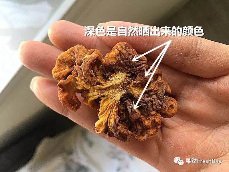 自然晒干的椴木金耳颜色会比新鲜的要暗,有很多会呈现出暗黄甚至黑黄的颜色,这些都是正常的颜色,用水泡开之后就会变回新鲜时的颜色。那些用硫磺熏制过的菌包金耳则会在干品状态下显示出鲜亮的黄色、橘红色。仙女们这时千万不要以貌取人,靓丽好看的,不见得是好东西,而那些丑丑的,干干的,黑黑的干品才是难得一寻的宝贝。