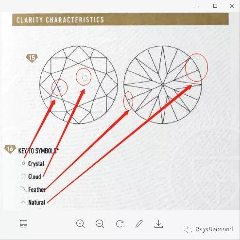 钻石≥1克拉,GIA证书附带净度素描图,我们可以通过净度素描图我们可以大概判断净度的好坏并且知道瑕疵的位置,瑕疵的位置最好是尽量不再台面的正下方,正下方会比较明显,尽量选择靠近腰楞的,靠近腰楞有个好处就是,做镶嵌,直接用爪子挡住就看不到瑕疵了。还有就是,画的越小越好,虽然说实物为标准,但是画图也是根据实物来画的,所以如果净度素描图画得很小也可以说,不是太明显。