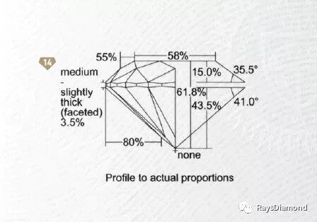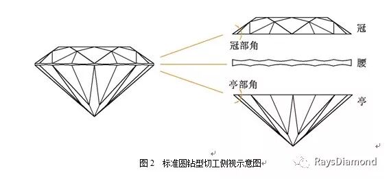 圆形钻石切磨通常由57个刻面组成,包含冠部、亭部、腰楞;冠角、亭角、台宽比、亭深比、腰厚比等。