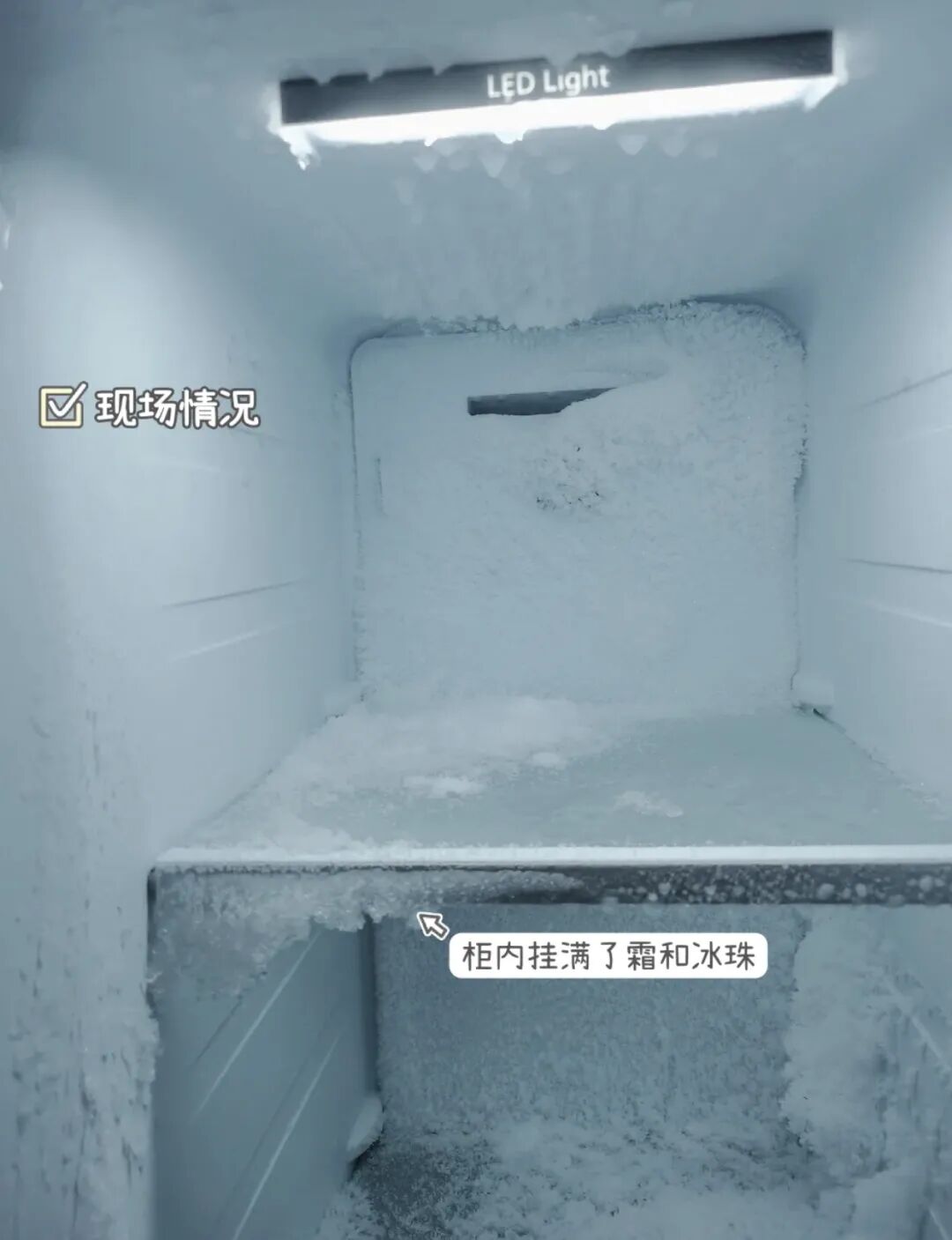 对于直冷冰箱,最大的诟病就是会结霜、结冰。其实它之所以会结霜,是它的工作原理导致的,无法解决。(直·冷,意思是通过蒸发器盘管的低温与冰箱内温度进行热交换的方式直接制冷。当水蒸气遇到温度很低的盘管后,内壁表面就会结霜。)