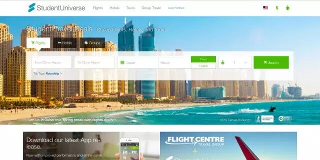 STUDENTUNIVERSE是一个针对学生机票的搜索引擎(要有.edu的邮箱并小于35岁)。虽然大部分情况下它不会比下面要介绍的KAYAK便宜,但有时候推出的学生机票还是便宜得吓人的。