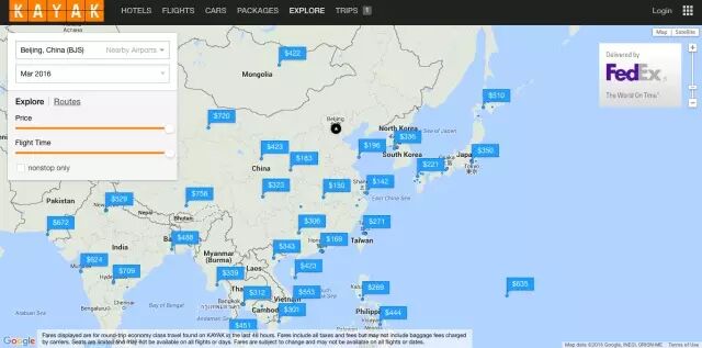 如果你只确定了大概出行时间,却没定下去哪里的时候,那就选用KAYAK吧,只要输入出发地和大概时间,就会帮你搜索出从你出发地出发的最便宜的机票。
