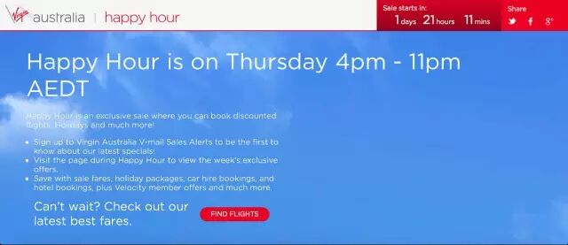 每周四4:00pm-11:00pm(澳洲东岸时间)为减价时段,只要在网站上看到 Happy Hour出现,就有机票特价活动。配合不同的节日,也会推出不同的特价方案,想买到便宜机票就必须勤快地经常上网页查看。