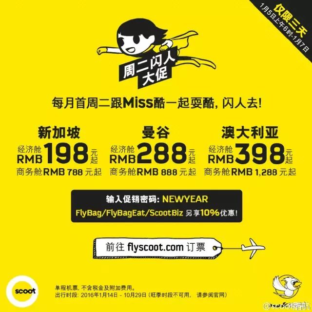 2016年,酷航正在进行一月一次的闪人大促!每次促销将会在每个月第一周固定的某一天,看这个价格心动了吗?