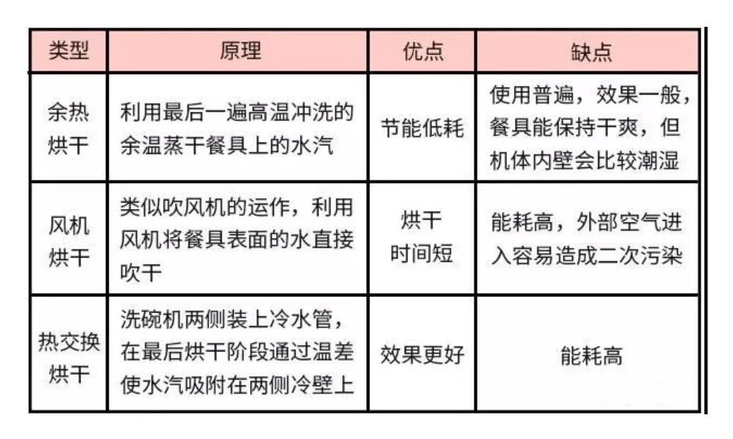 市面上洗碗机的烘干工艺主要有三种:余热烘干、风机烘干、热交换烘干(价格会比较贵)。看了下面小编做的这个表格,大家可以更直观的了解↓↓↓