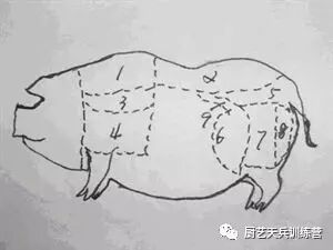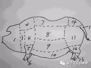 1、猪头 2、凤头皮肉 3、槽头肉 4、前腿肉 5、前肘 6、猪手 7、里脊皮肉 8、正宝肋 9、五花肉 10、奶脯肉 11、后腿肉 12、后肘 13、后脚 14臀尖 15、猪尾巴。