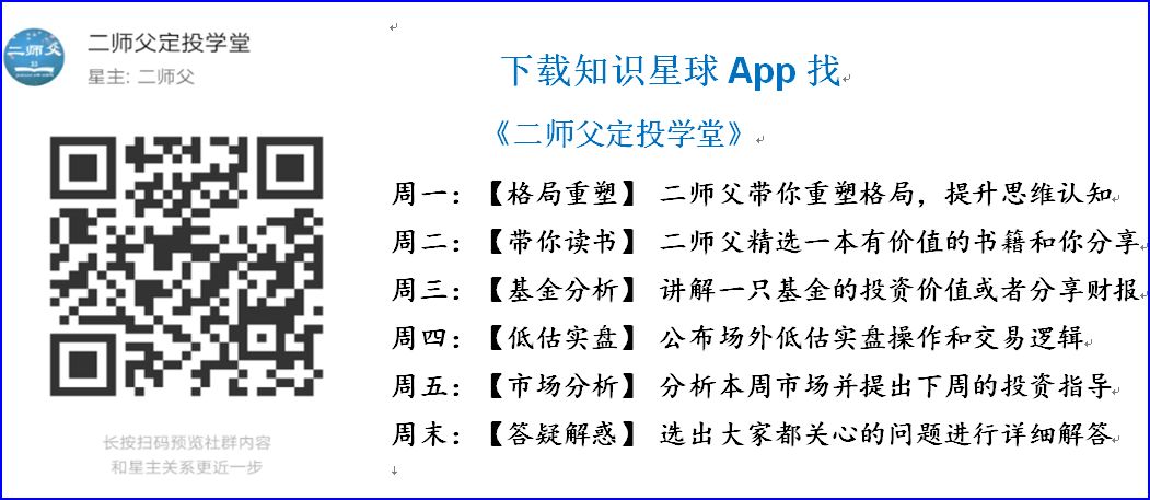 公众号太封闭,不利于读者的学习和交流,为了促进读者深入交流和学习,二师父在知识星球建立了定投学堂,按下方二维码可获取(包括但不限于)