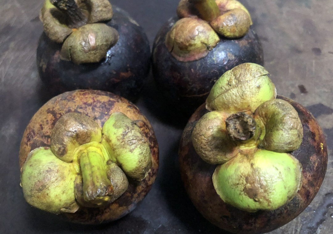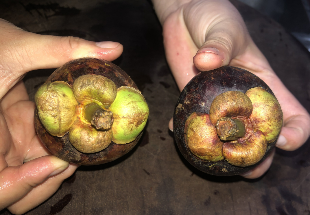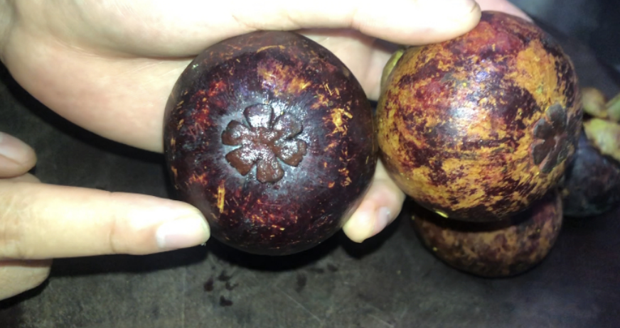 这个花瓣片数是有学问在里面的哦,每一瓣花瓣代表着一片果肉,花瓣越多代表果肉越多哦,因此你在购买山竹的时候可以根据山竹底部的花瓣片数来选购山竹。
