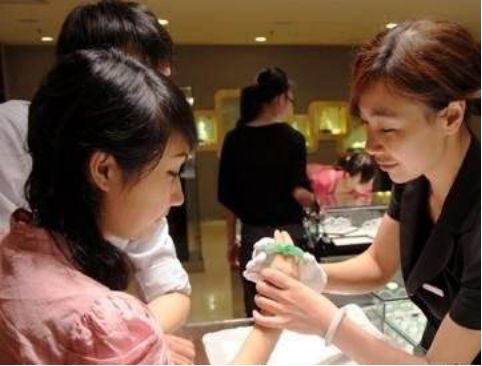 选择翡翠手镯时一定要记得涂些洗洁精这类的润滑剂让手掌的两端骨头比较滑,戴起来就会比较容易。