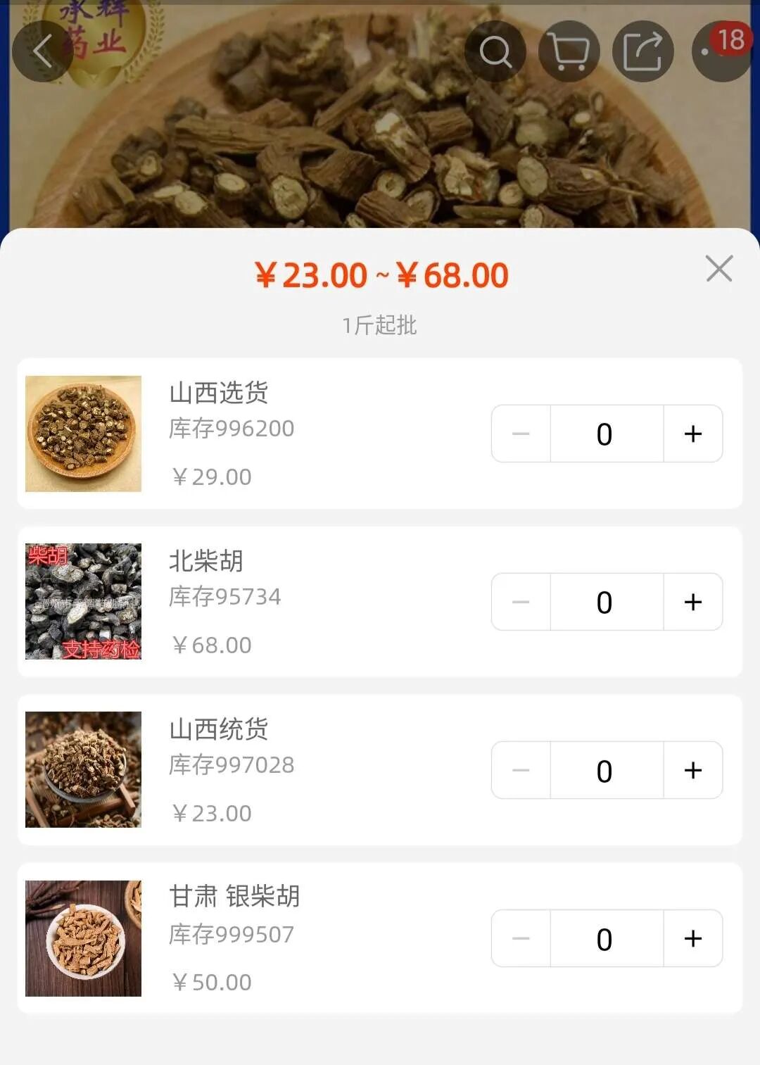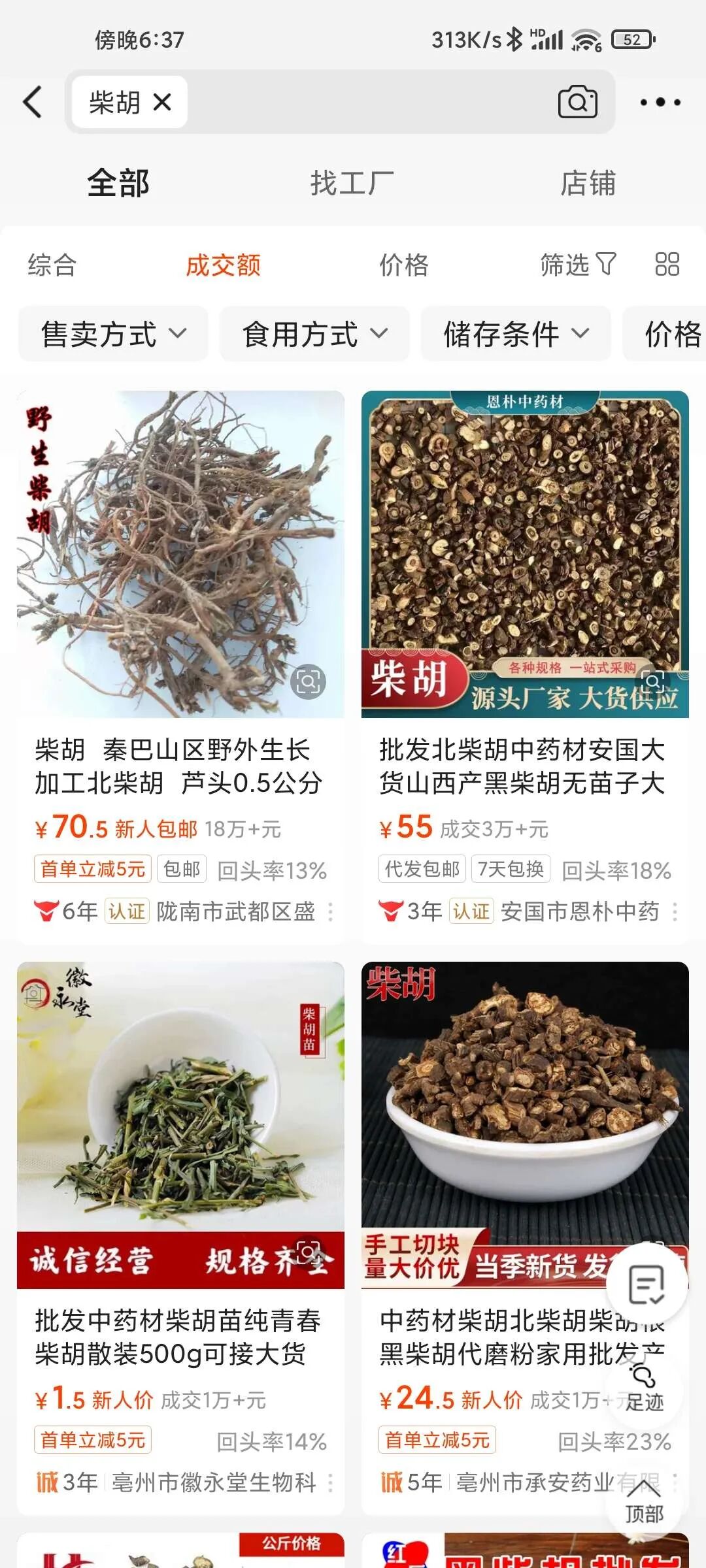 比如在里面搜柴胡,按销量排就可以看到柴胡的批发价大概是在什么价位。不同种类的柴胡的价位也分的清清楚楚。你依据这个价格在拼多多上或者淘宝上去找。如果价格低于阿里上的价格,那么基本上是假货。淘宝和拼多多上的价格,加上邮费应该会比批发的价格要略贵一些。