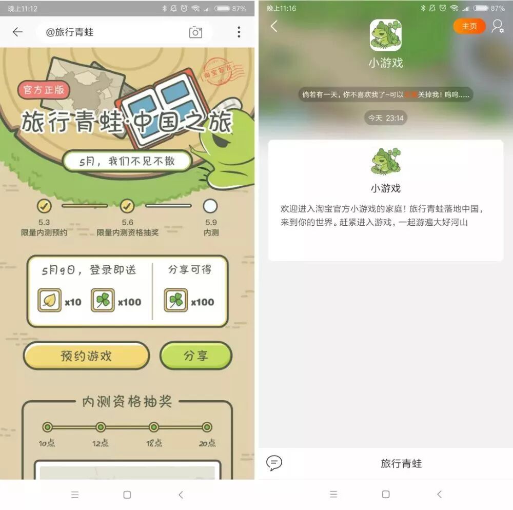 近日,年初曾备受关注的日本佛系游戏《旅行青蛙》终于开启中文预约测试,有趣的是这款游戏的预约入口,竟然是放在了淘宝App中。(因为阿里游戏拿下了《旅行青蛙》中国代理权)同时,中文版这次不是把原版照搬一遍,而是在文本中文化的同时,也加入了更多本土化内容。