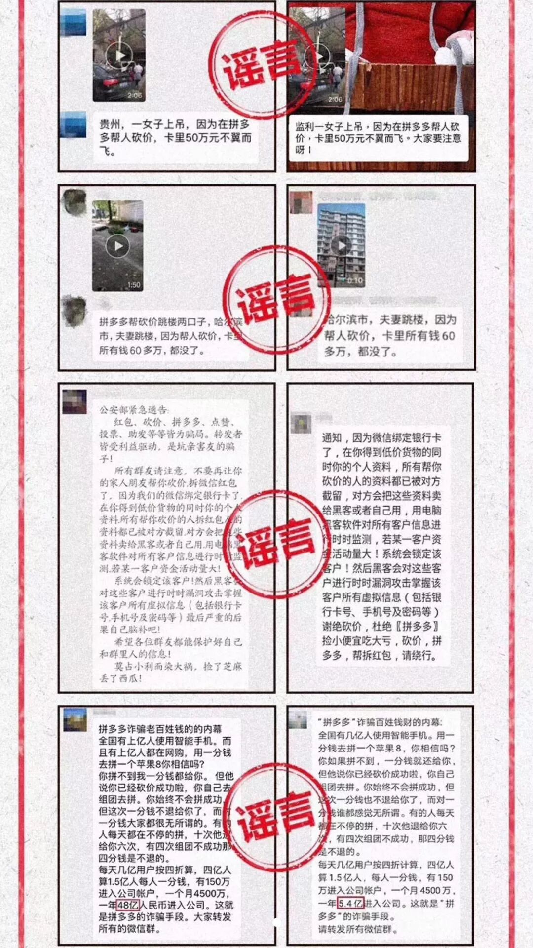 日前,拼多多表示自今年1月起,持续遭受诸如拼多多1分钱抽奖诈骗、砍价被盗银行账号、夫妻砍价被扣60万跳楼 等刷屏式谣言攻击,这些谣言专门挑选跳楼、上吊、诈骗、盗号等耸人惊闻的题材,将毫不相干的旧新闻改头换面,嫁接在拼多多身上。