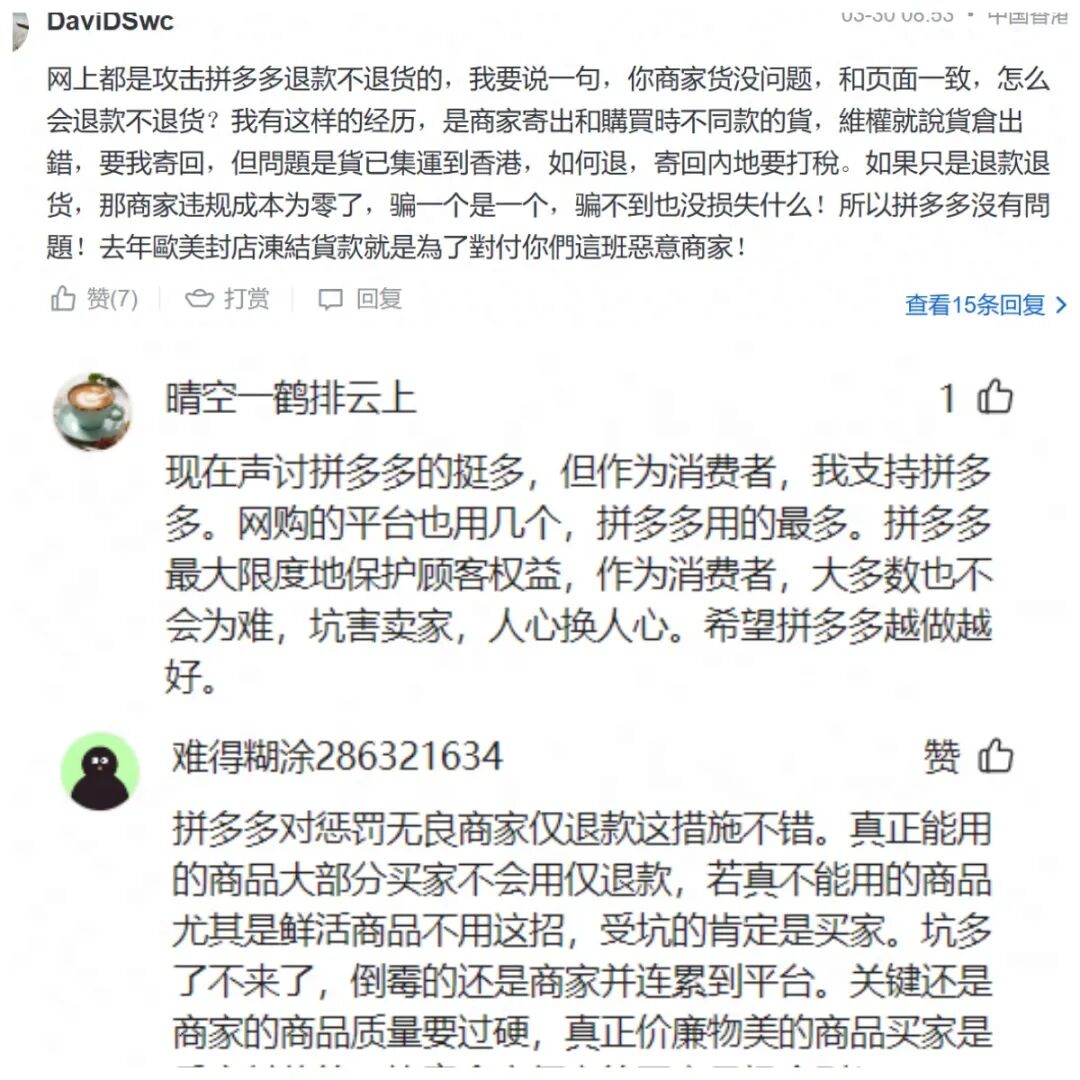 而拼多多上那些被指对商家「苛刻的平台规则」,不仅是为了提高售假商家的成本从而逼迫他们退出,恰恰也是保证消费者体验和权益的关键。很多网友都指出,如果商家的产品没问题并与页面一致,普通消费者怎么「仅退款」?拼多多和消费者本质上也是在清理那些不良商家,维护更好的买卖生态。