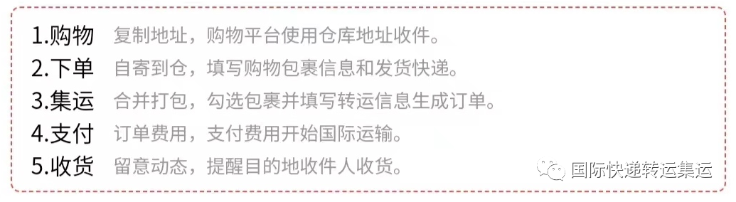 具体操作:把网购送货地址换成集运代理仓库地址→货到齐了提供地址→让仓库打包→选择运输的方式→支付运费→完成流程。