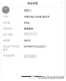 在食品的销售介绍页面,我们可以找到食品的详细参数,其中对我们找到厂家有用的信息是食品生产许可证编号: