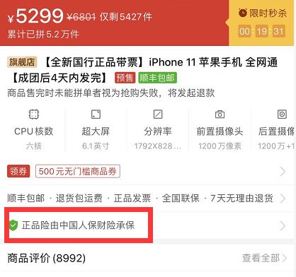 低售价之外,还给了用户一个定心丸,所有百亿补贴活动中的商品:正品保证,由中国人保财险承保,假一赔十,全国联保提供发票。