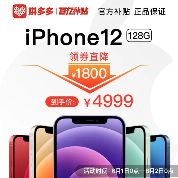 很多小伙伴都会等一年一度的618来买苹果产品,拼多多百亿补贴苹果专场,超级好价!6月1日0点,Iphone12 128GB直降1800元!错过再等一年哦~