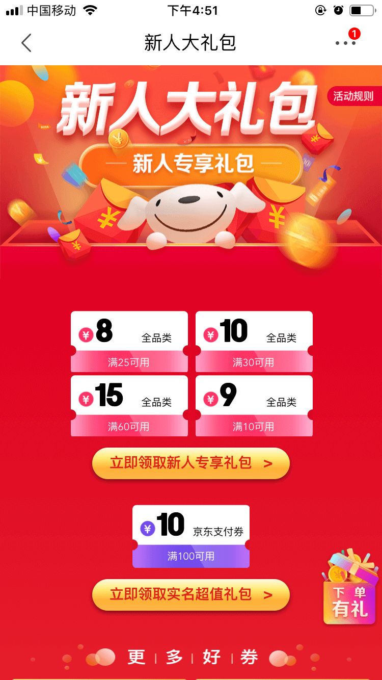 目前来看,各大平台针对「新用户」发放的优惠力度最大。比如说,我今天注册了一个全新的 JD 账号,打开 App,就收到了这样一张优惠券: