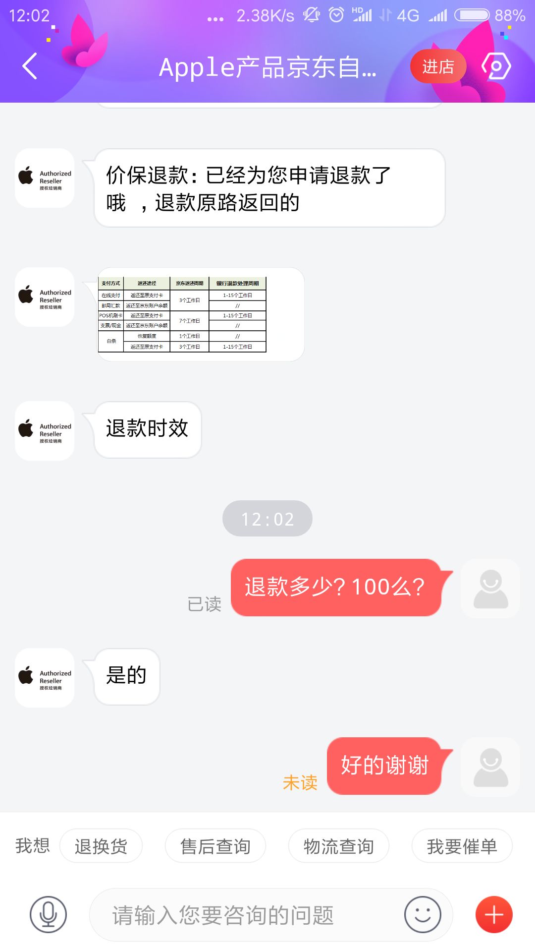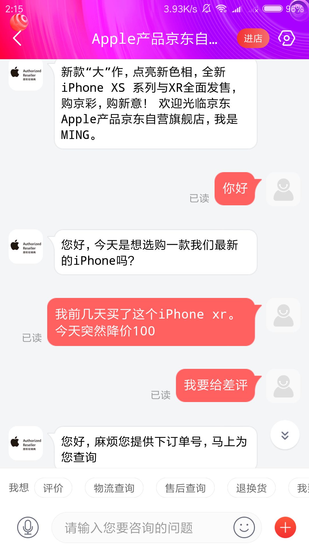不要慌,你可以马上找客服,跟客服聊天,就说我昨天在你们这儿买了一台 iPhone,今天降价了600元,我要申请价保。如果客服不同意或者装糊涂(这个客服可能是实习生),你就假装气愤地说:我要给差评、我要投诉、我要退货之类的话。这招绝对管用,感觉像是白捡了一样。