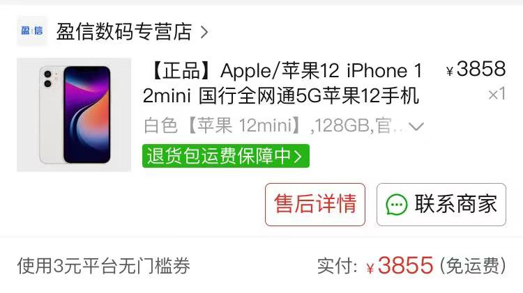 但购买苹果12mini手机,我确实渴望了许久,终于在收到副业收入后,就选择了一家观望许久的店铺,付款3858元购买了手机。