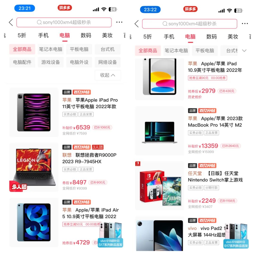 拼多多百亿补贴先后启动了对小米全品类商品加补、对3C数码多品类的五一超级加补、电脑超级加补和家电超级加补。