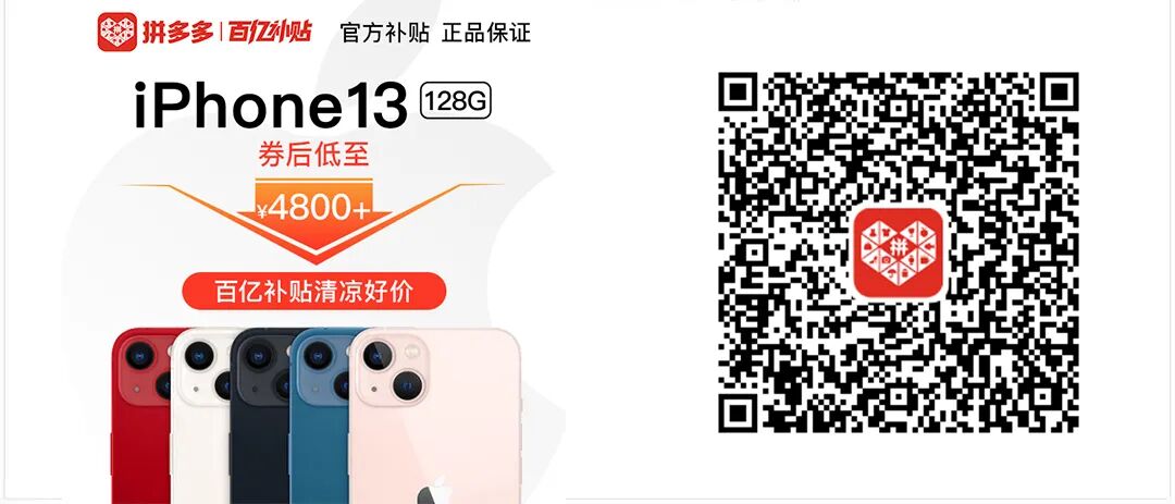 现在,拼多多百亿补贴清凉节大促来袭!7月13日0点起,击穿底价!更有限时狂撒百元劵包等你来领!iPhone 13劵后低至 4800+!早买早享,抢到即赚!