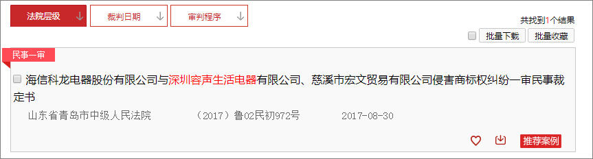裁判文书显示,去年7月11日,青岛市中级人民法院立案了海信科龙电器股份有限公司与深圳容声生活电器有限公司、慈溪市宏文贸易有限公司侵害商标权纠纷。