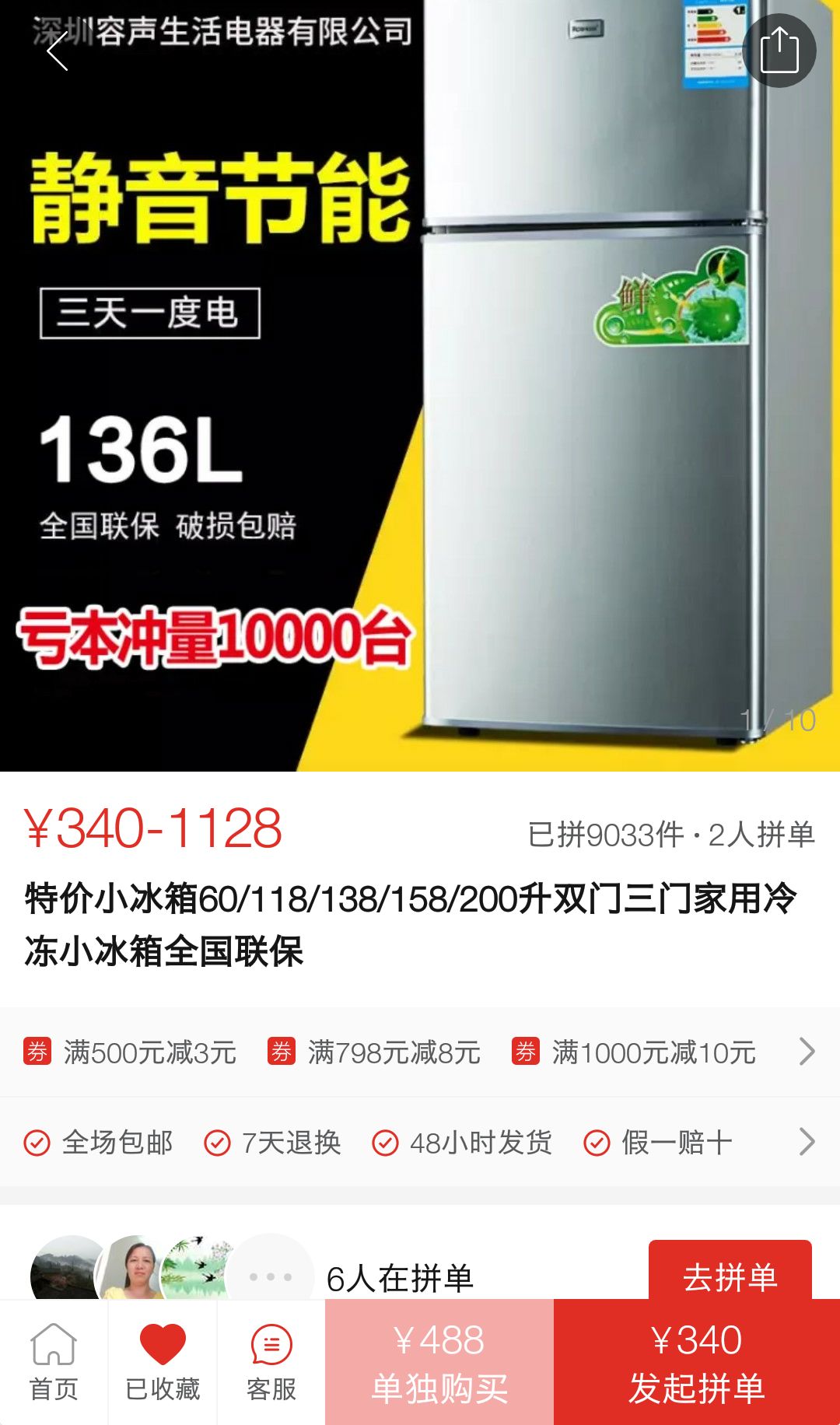 7月31日,公司深读在拼多多上以容声冰箱为关键词进行检索,初步检索后,共发现三款品牌包含容声字样且销量超过6000的产品,分别为刘氏电器销售的特价小冰箱、施泽普电器销售的保修十年 特价冰箱和爱家正品电器销售的深圳荣升迷你小型冰箱。