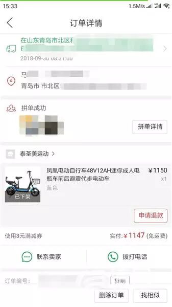 既然找到了问题,马先生就赶紧联系拼多多以及销售电动车的店铺。