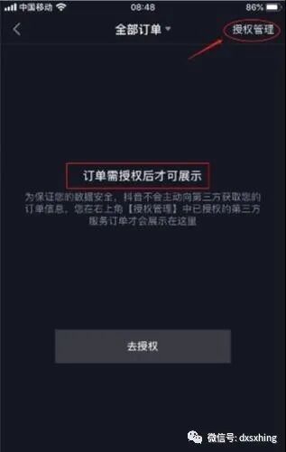 2、进入订单设置页后,就能看到提示订单需授权后方可展示,也就是需要主动授权抖音平台方展示第三方订单信息,点击右上角授权管理。