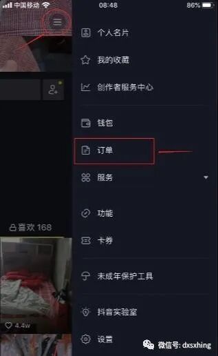 1、首先,打开抖音主页面,点击右下角我,在个人设置页面,点击右上角,拉出个人设置详情,选择订单,如图示图标。