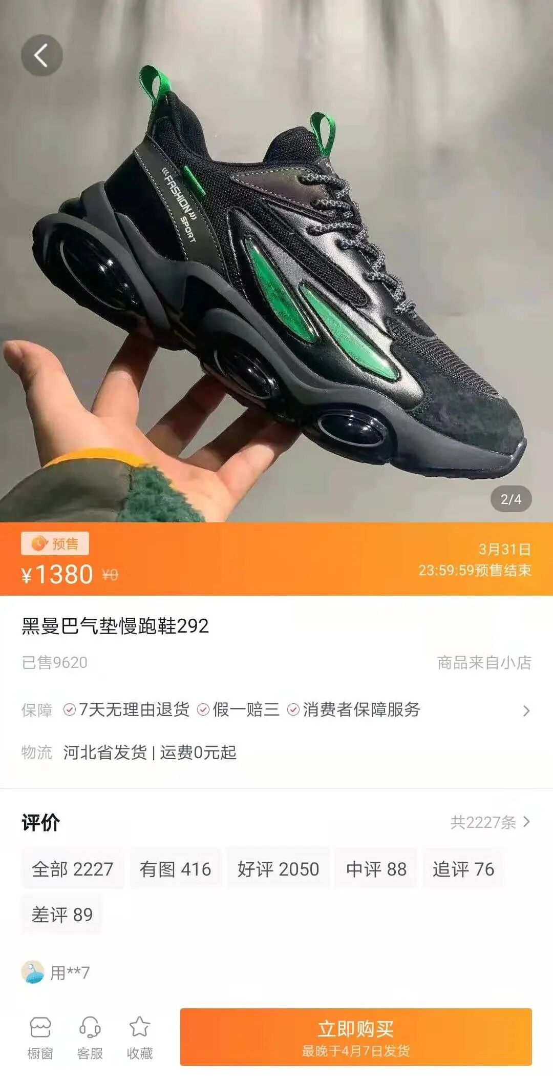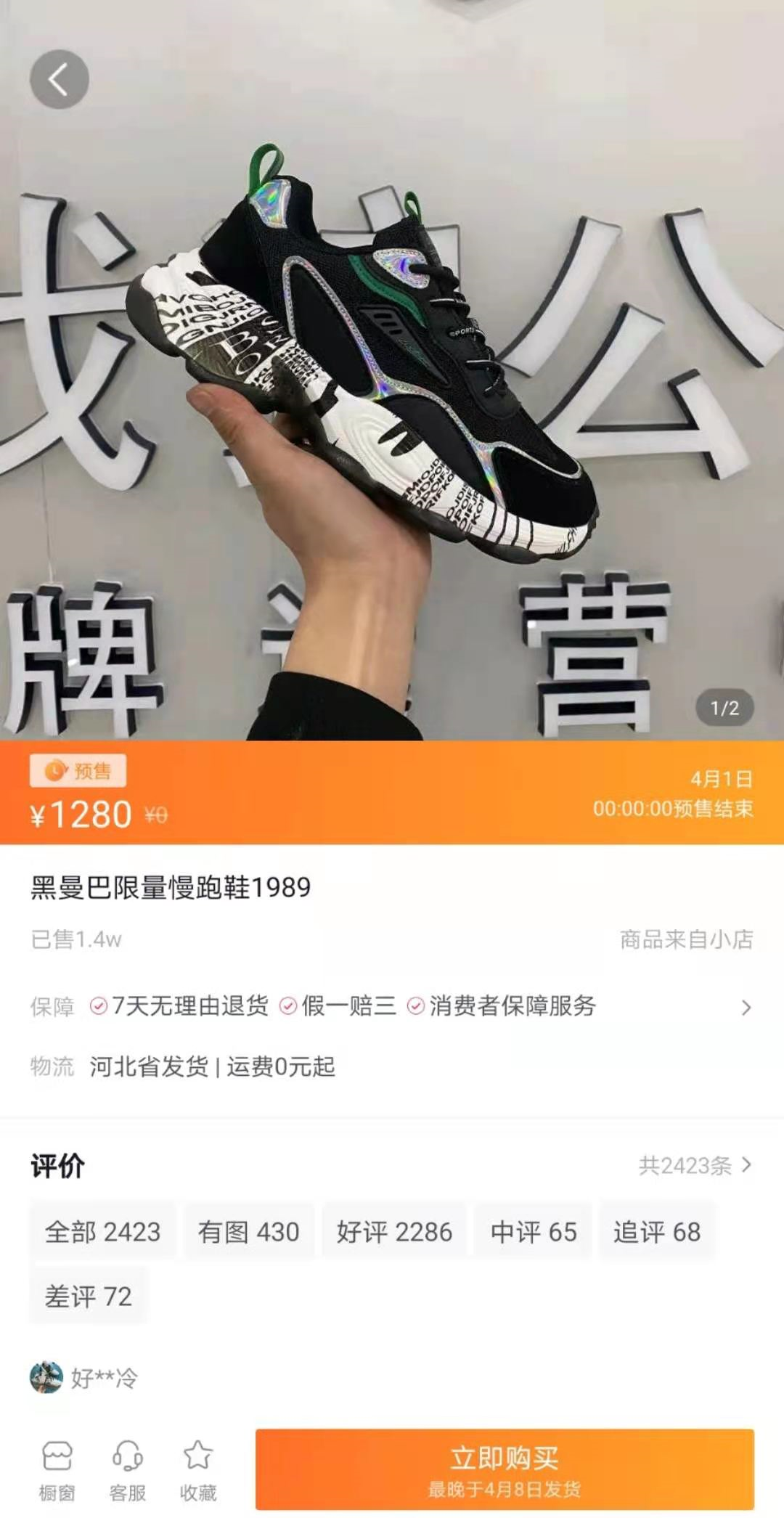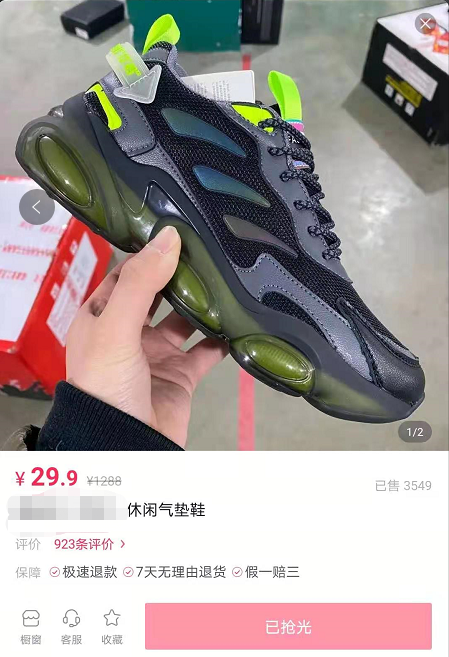 举例这款鞋,标价的时候哈1380米,然后直播的时候主播开始絮絮叨叨的说这么鞋怎么爆米花底,啥做工啊什么有运费险啊一堆一堆的然后设置个158米20双然后就抢!!!然后就有很多人购买玩饥饿营销,一晚上搞个20-30款有的库存会上多点100双然后也是20分钟左右被抢光,那么我们再看一般淘宝京东拼多多发货都是当天或者2天内对吧?