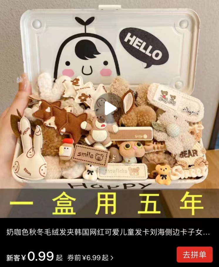 很多新人打开拼多多,似乎发现了新大陆。氛围感假发片、明星同款耳钉、XX明星都在用的小发卡……在这一消费过程中,义乌、即墨、桐城等地的小商品开始飞向全国的消费者手中。
