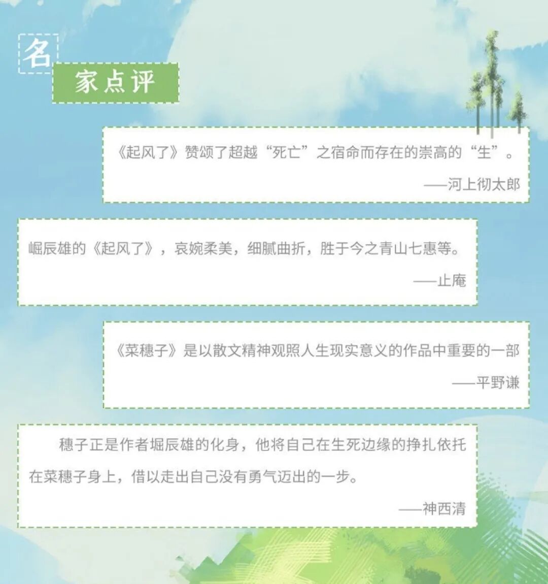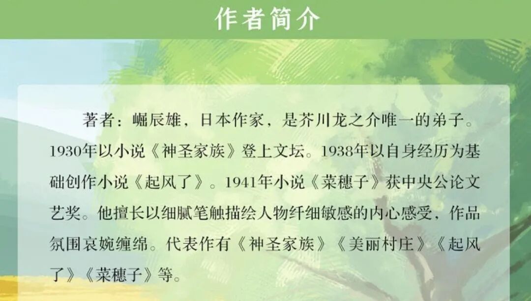 作为日本昭和时代新心理主义代表作家的崛辰雄,最擅长细腻的人物心理描写。而他自己常年病重的经历与现实生活中妻子的患病离世,写了《起风了》和《菜穗子》这两本代表作。