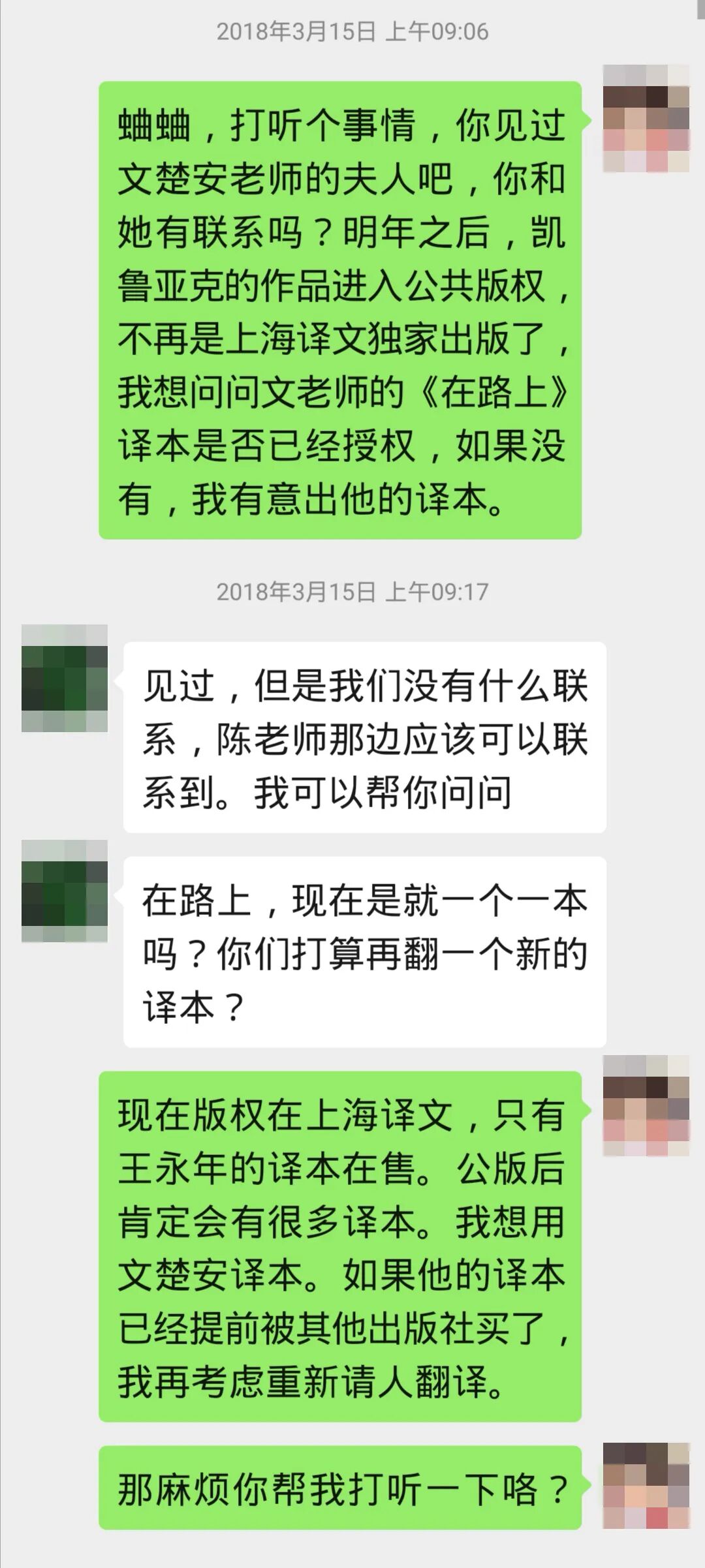 本来是请蛐蛐帮忙联系文老师夫人的,她辗转问了陈老师,结果陈老师诚恳地给我提出建议:文老师的译本很传神,但由于时代限制,译文有不少错漏;文老师既已作古,无法亲自修订,因此不建议再版。(我读《在路上》文楚安译本几乎是一气呵成,殊觉畅快;得此提醒后,方才找来英文原版,抽样比对,意识到陈老师所言非虚。)