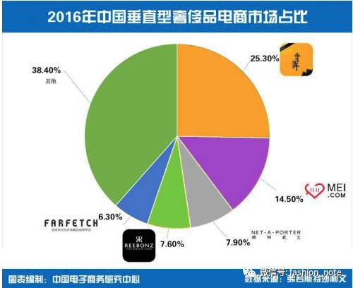 除了这些本土的奢侈品电商网站,还有Yoox、Net-A-Porter、Farfetch(已经被京东入股)这些国际奢侈品电商网站在瓜分中国市场,这里有一张市场份额图,这张图只展现垂直类奢侈品电商的市场占比: