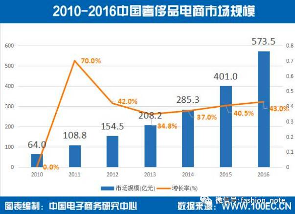而在中国的奢侈品市场里,奢侈品电商的规模增长非常快:2016年,中国奢侈品电商市场规模达到了573.5亿元,跟2015年的401亿元相比,增长了43%。