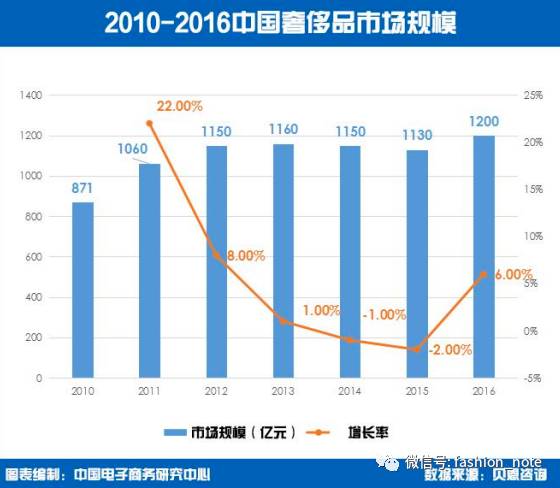 而中国呢?2016年,中国奢侈品的市场规模是1200亿元,比起2015年的1130亿元,增长了6%。