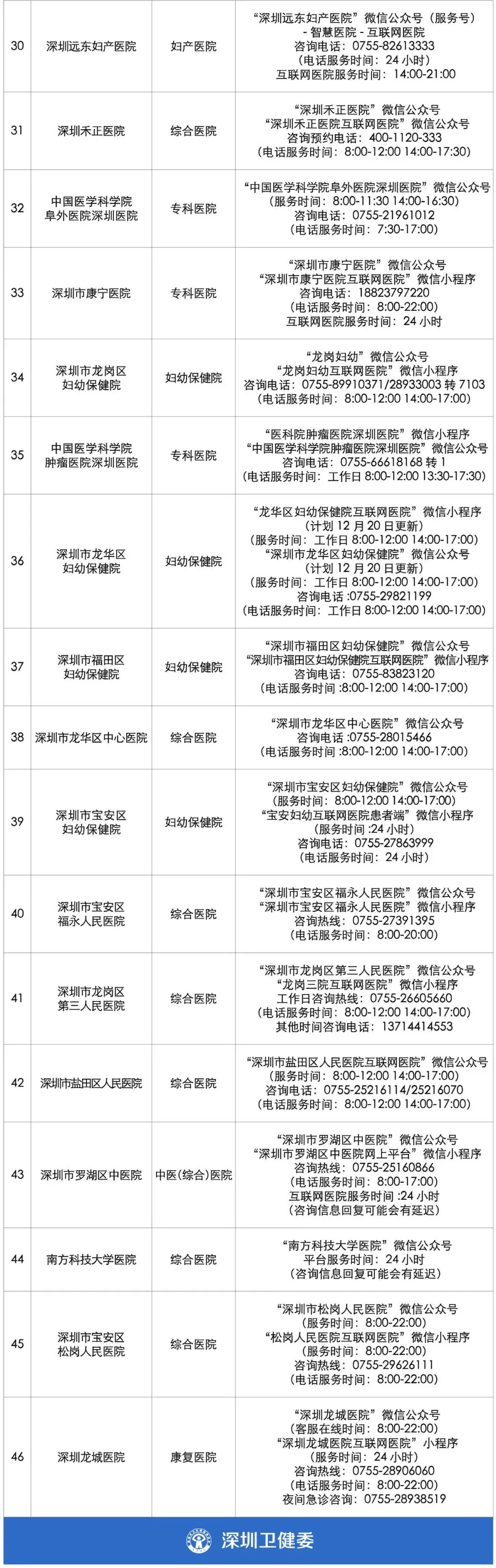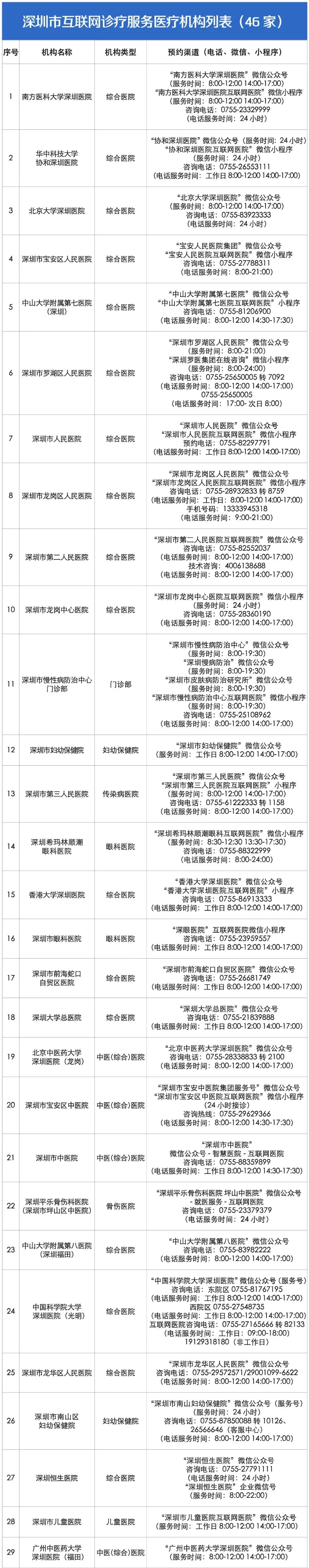 目前,深圳有46家互联网医院可线上问诊,名单如下: