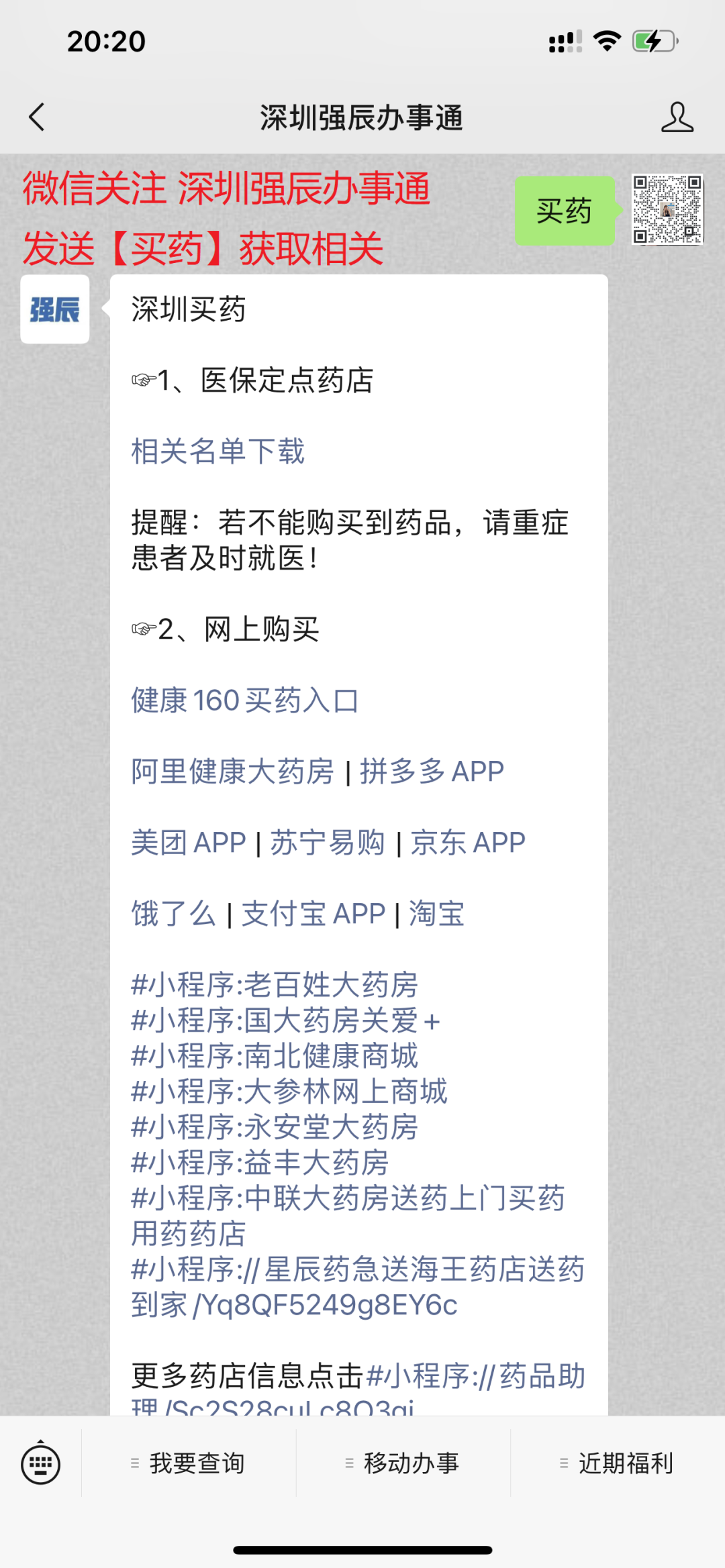 点击下方的名片,在深圳强辰办事通公众号回复【买药】,即可直接进入线上买药入口