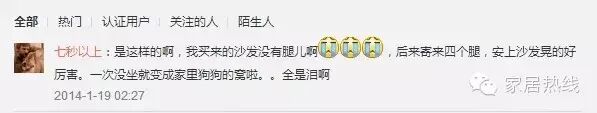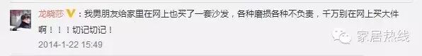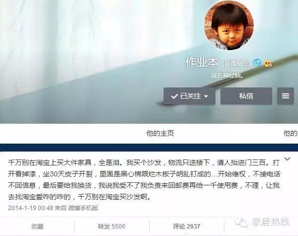 网购家具血泪多?新浪微博大V@作业本曾在微博上吐槽千万别在淘宝上买大件家具,全是泪,讲述其在淘宝买沙发遭遇的质量差、退货难、维权不易的遭遇,获得网友共鸣纷纷吐槽自己网购家具的血泪经历,转发5506次,评论2937条。
