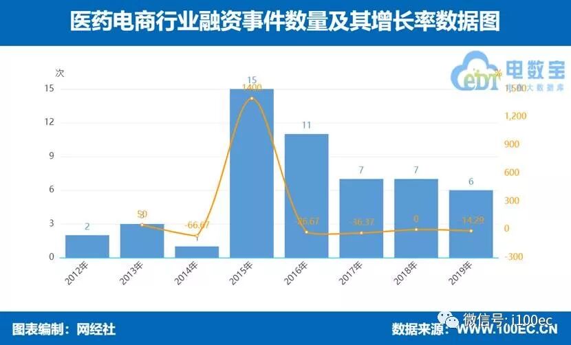 在融资事件和总额方面,医药电商近几年也较受资本青睐,2019年发生6期融资事件,融资总额10.7亿元,但同比下滑42.48%。