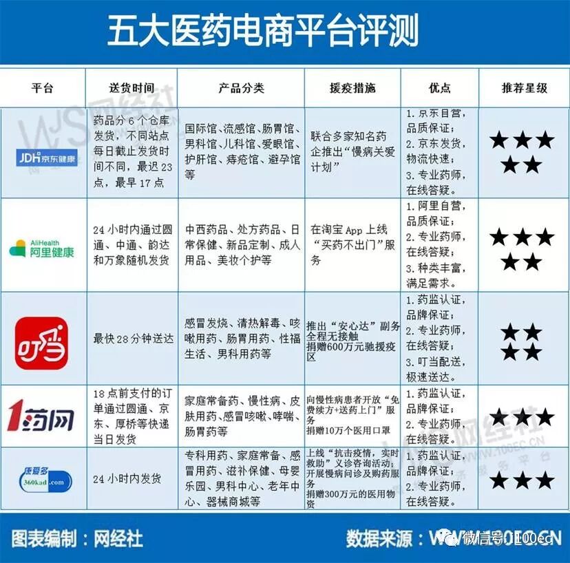 网经社挑选京东健康、阿里健康、叮咚快药、1药网、康爱多五家主流医药电商平台,从送货时间、产品分类、援疫措施、平台优势四方面进行分析。
