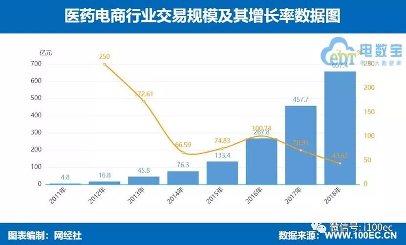 据网经社电数宝监测数据显示,自2011年以来,医药电商行业交易规模持续增长,在2018年,行业交易规模达657.4亿元,同比增长43.63%。