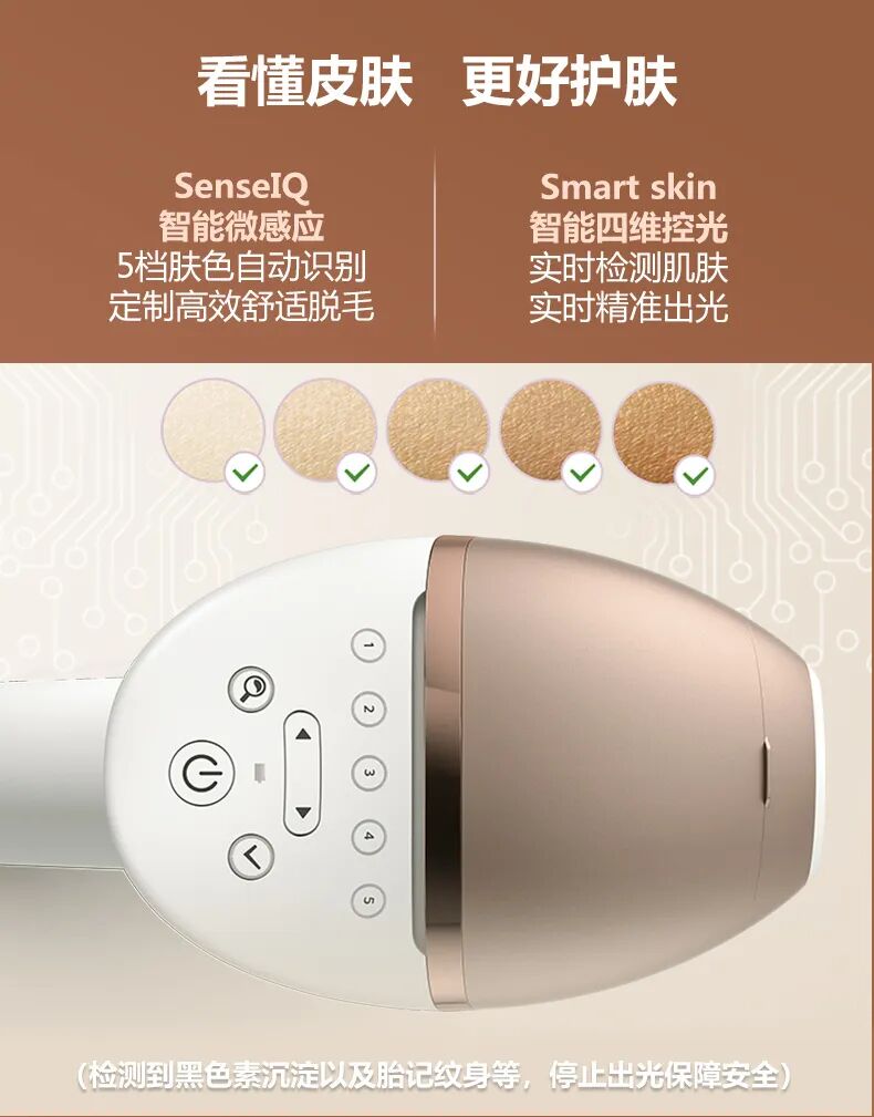 这款脱毛仪最大的优势是采用了smart skin智能思维控光技术,能实时自动检测肌肤的状态,根据不同的肤色、胎记等,自动调解精准出光,完全保障出光的安全性,即便有胎记、纹身也不用担心。