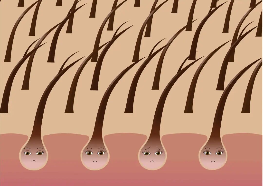 这其中最关键的部分是毛囊组织,毛囊内的上皮细胞通过分裂、繁殖促进毛发更换和增长,毛发也通过毛囊吸取养分,所以当毛囊受损后,毛发生长速度就会受到影响,甚至不在生长。