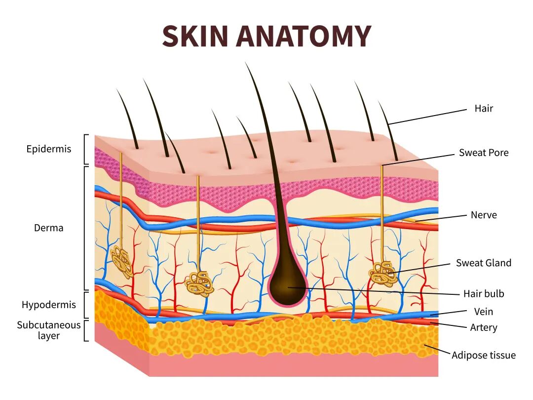 我们的毛发从下向上可分为毛乳头、毛囊、毛根和毛干四个部分。露在外面被大家看到的部分是毛干,藏在皮肤里面的是毛根,毛囊是包裹毛根的上皮组织,毛乳头就是毛囊末端连接毛细血管和神经末梢的组织。